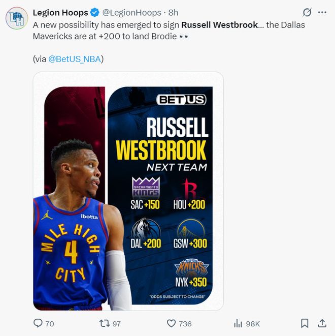 如此一来国王就腾出一个席位签下威少,威少可以签下一份229万的老将底薪,从威少的下家赔率来看国王第一、火箭第二、独行侠第三、勇士第四、尼克斯第五,他大概率就是要去萨克门托了。